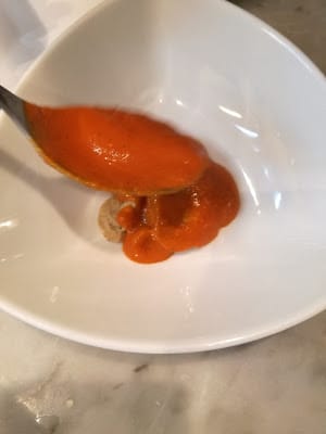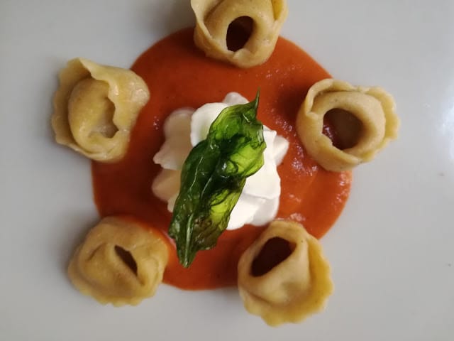 Tortellini di melanzana pura, salsa di pomodorini confit, spuma di ricotta salata, basilico fritto