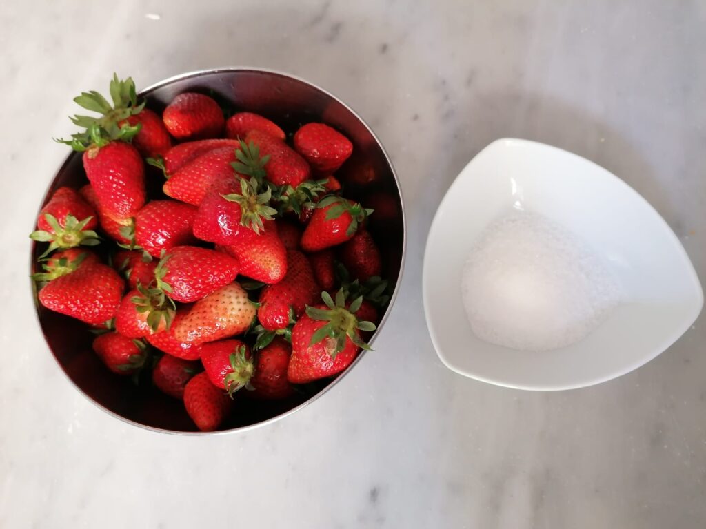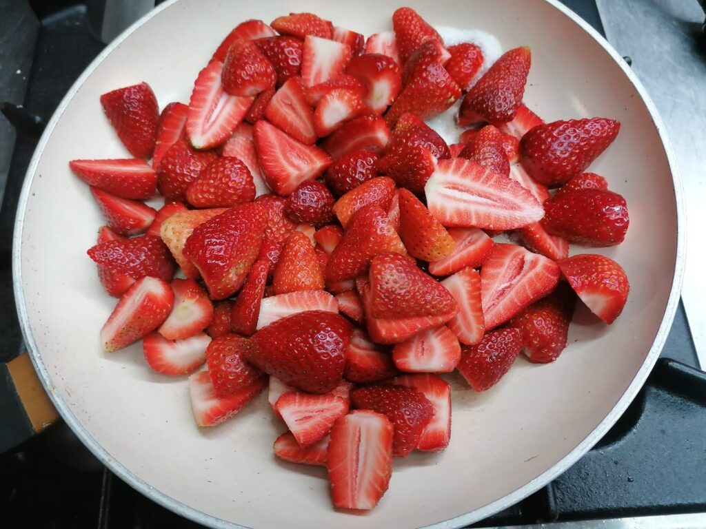 Meanwhile, cut 1 kg ( 2,2 Lb) of straberries in halves and weight 50 gr ( 1 1/2 oz) white sugar.